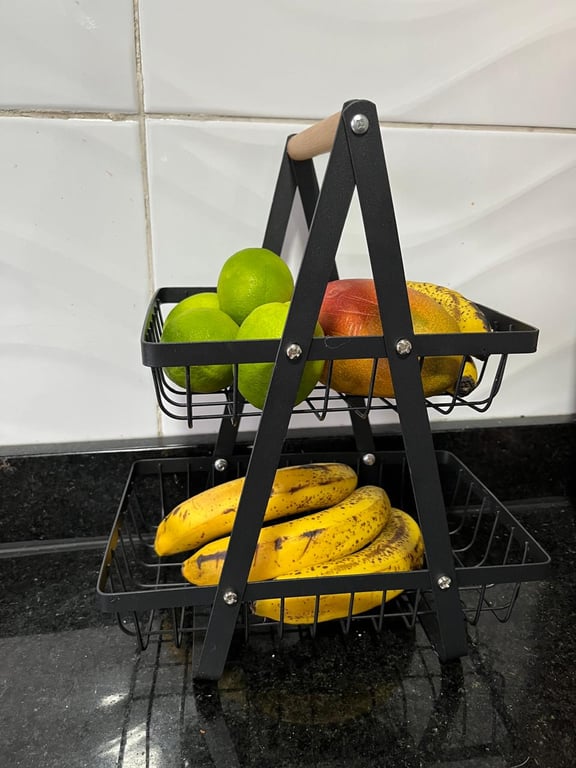 A Fruteira de dois andares de metal é compacta, e fica linda em todos ambientes, cozinhar ou sala de jantar